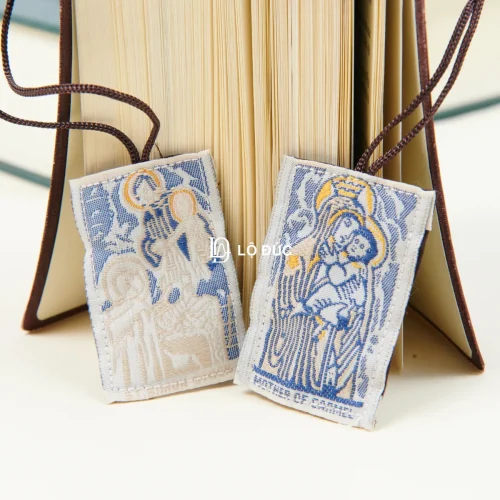 - Hình ảnh hai mặt: Nổi bật với hình ảnh Đức Mẹ bồng Chúa Hài Đồng và Gia Đình Thánh Gia được thêu tinh xảo bằng chỉ màu xanh dương, vàng và trắng. Phía dưới là dòng chữ “MOTHER OF CARMEL” (Đức Mẹ Núi Cát Minh), thể hiện rõ lòng sùng kính đối với tước hiệu này của Đức Mẹ.