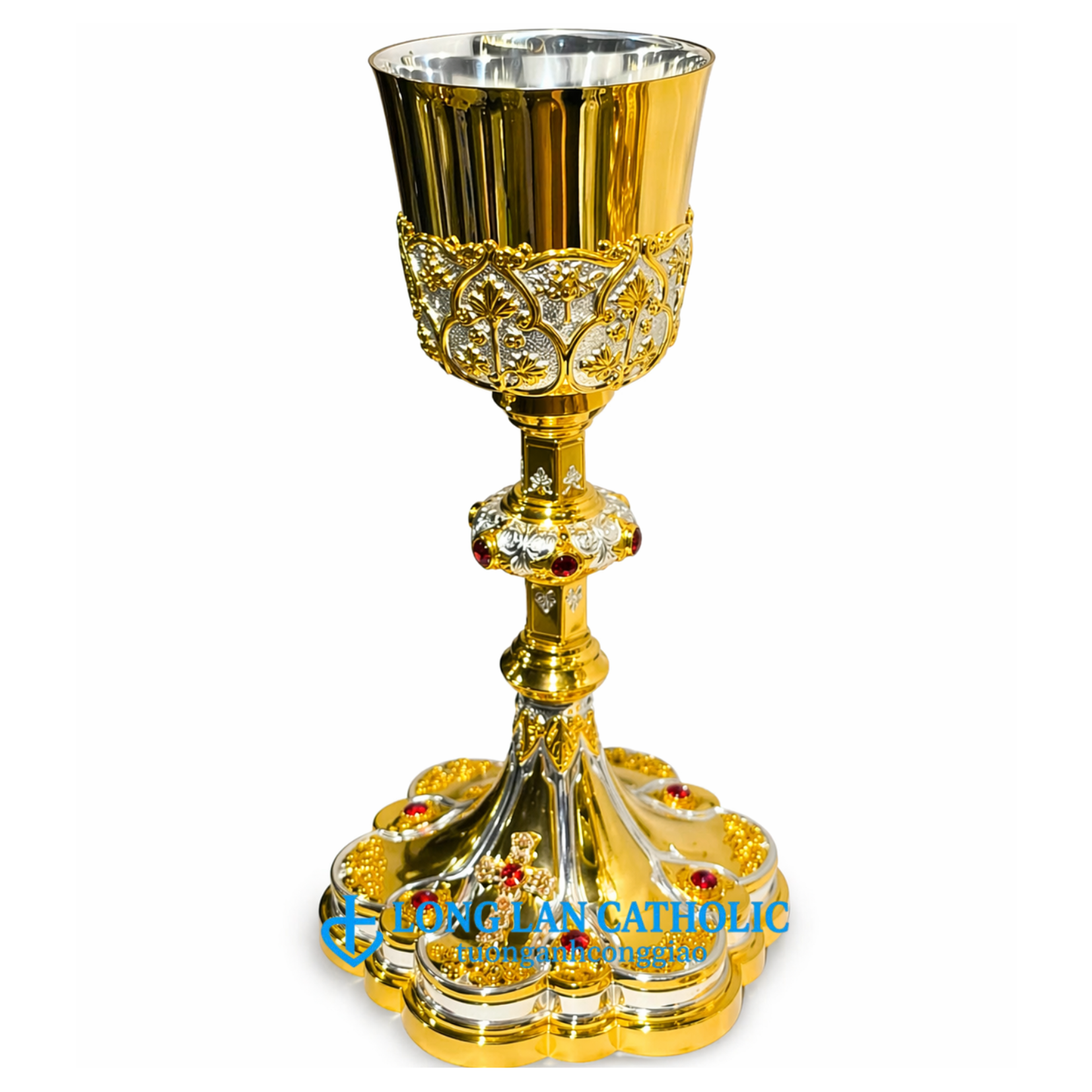 Chén Lễ Chạm Nổi Thập Tự Giá & Đính Đá Ruby Cao Cấp Phối Màu Vàng Bạc – Mã # ML 16