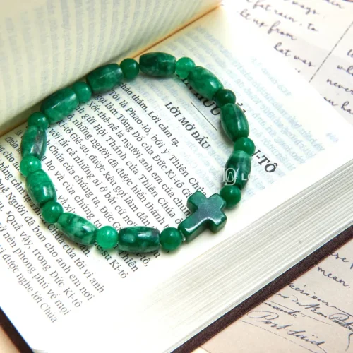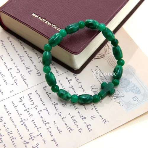 Vòng tay chuỗi Mân Côi được chế tác từ đá xanh ngọc thạch anh thiên nhiên, mang gam màu xanh lá đậm nổi bật, giúp thu hút năng lượng tích cực và tạo cảm giác bình an. Hạt đá được mài tròn hoặc dáng trụ đa dạng, phối hợp hài hòa, nổi bật với hạt thánh giá đá đồng màu xanh đặt ở vị trí trung tâm, thể hiện ý nghĩa đức tin sâu sắc và nhắc nhở cầu nguyện mỗi ngày.