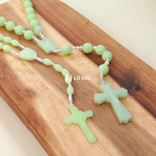 Chuỗi Mân Côi nhựa phát sáng xanh ngọc, 2 kiểu hạt (tròn và oval) – hỗ trợ cầu nguyện ban đêm, nhẹ nhàng và thiêng liêng.