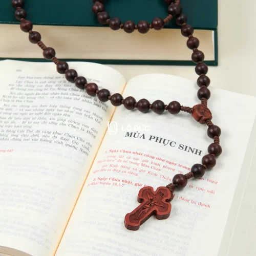 Chuỗi Mân Côi 50 Kinh Gỗ Nâu Đỏ – Thánh Giá Khắc Nổi, #Hạt-Tròn Cổ Điển