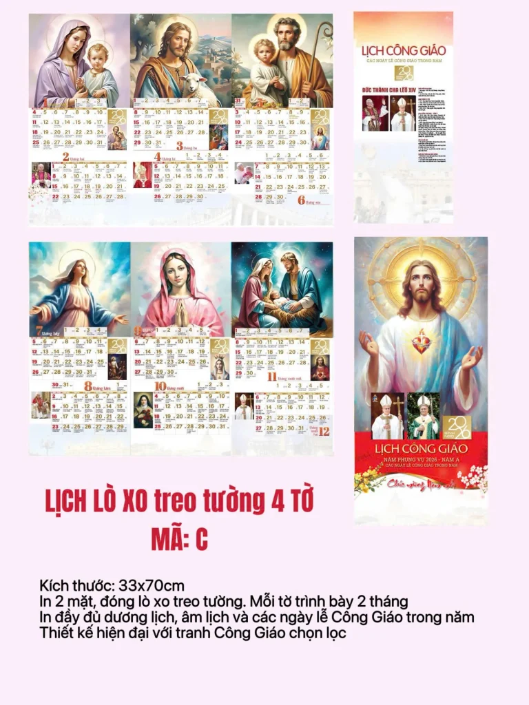 Thiết kế lịch gồm 4 tờ in màu sắc nét, mỗi tờ mang một hình ảnh Công Giáo ý nghĩa như Chúa Giêsu, Đức Mẹ Maria, Thánh Gia Thất, Lòng Chúa Thương Xót – giúp người tín hữu sống trọn năm trong niềm tin và ơn lành.