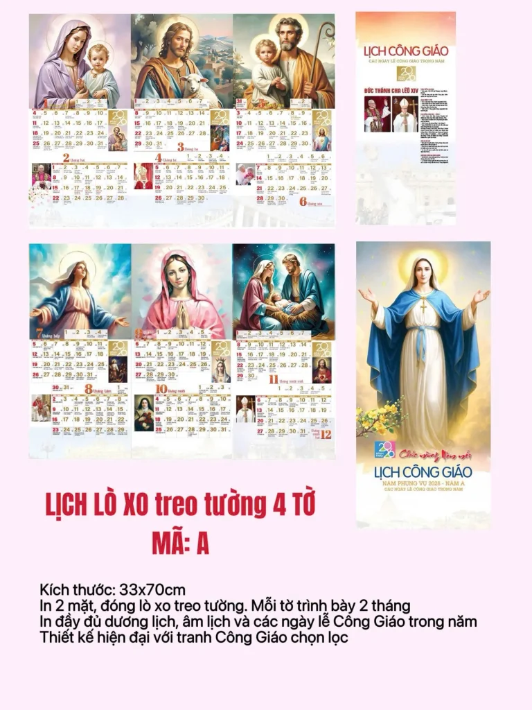 Lịch Lò Xo Treo Tường 4 Tờ Công Giáo là lựa chọn trang nhã, thiêng liêng cho mọi gia đình và giáo xứ trong dịp Giáng Sinh – Năm Mới.
