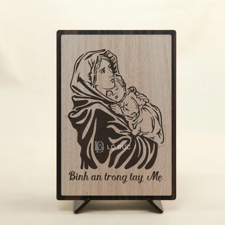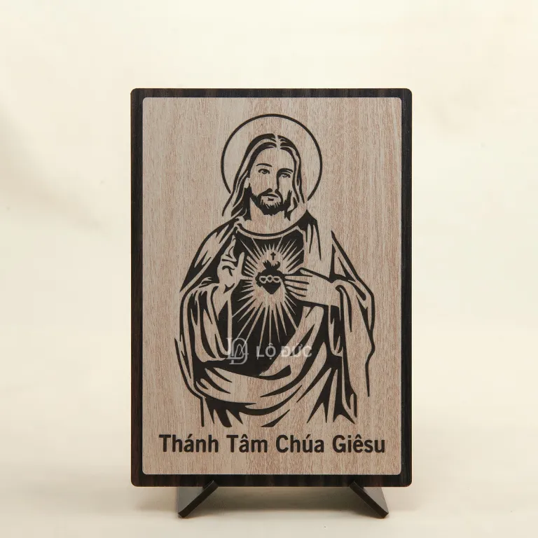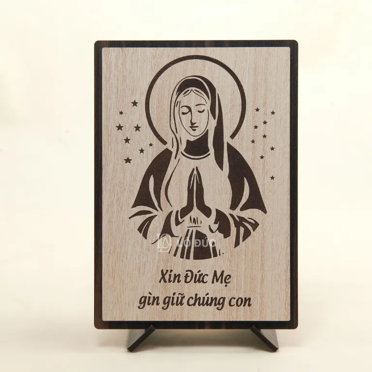 Bức tranh gỗ khắc laser tinh xảo, tái hiện vẻ đẹp thiêng liêng trên chất liệu lamina vân gỗ tự nhiên, trang bị đế để bàn tiện lợi.