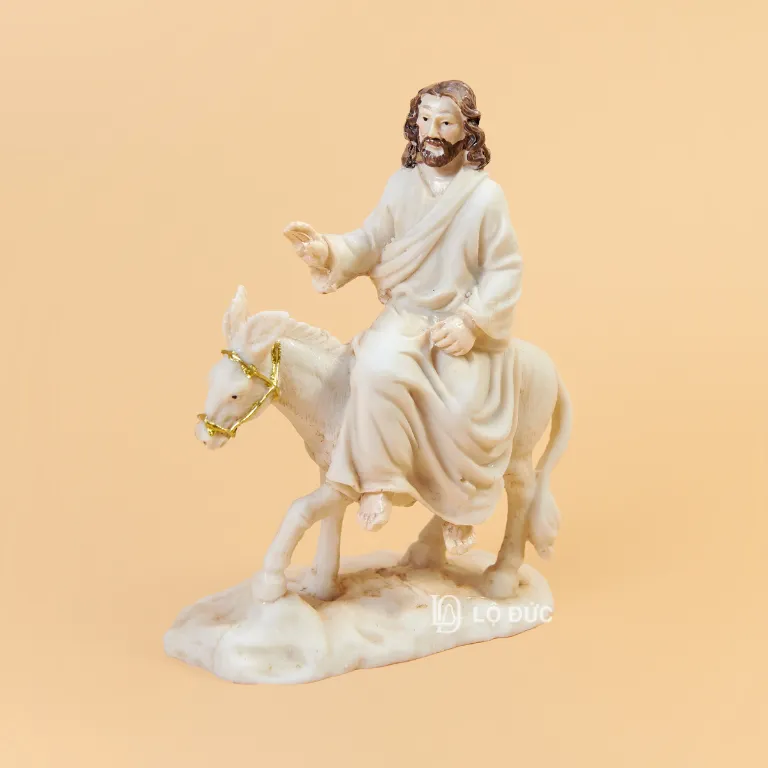 Hình ảnh Chúa Giêsu cưỡi lừa tiến vào thành Giêrusalem là một biểu tượng đặc biệt về sự khiêm nhường, yêu thương và bình an. Tượng được chế tác từ đá nhân tạo cao cấp, màu trắng ngà nhã nhặn, viền ánh vàng tinh tế ở yên cương, tái hiện khoảnh khắc thiêng liêng của Chúa trước Cuộc Thương Khó.