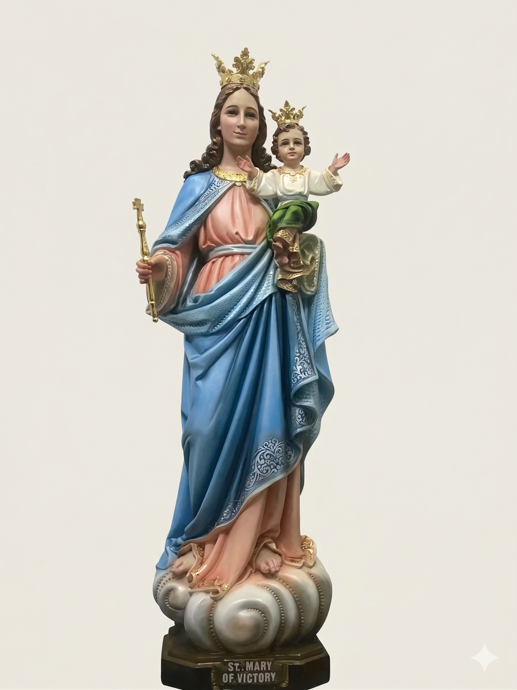 Tượng thường được khắc họa với hình ảnh Đức Mẹ bế Chúa Hài Đồng, tay cầm quyền trượng hoặc tràng hạt, thể hiện sự che chở và quyền năng.