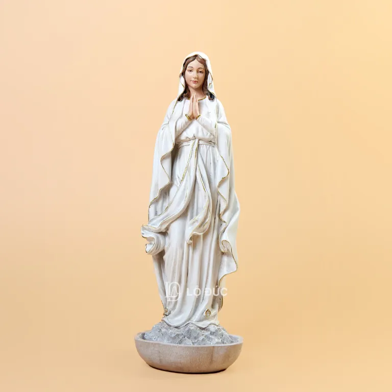 Tượng được chế tác từ chất liệu composite cao cấp, mang đến độ bền cao và sắc nét trong từng chi tiết. Phần áo choàng có những đường viền ánh kim nổi bật, làm nổi bật sự trang nghiêm nhưng vẫn rất nhẹ nhàng của Đức Mẹ. Dáng đứng uy nghiêm, chân đặt trên bệ đá – tượng trưng cho sự bảo trợ và che chở của Mẹ trên mỗi người con.